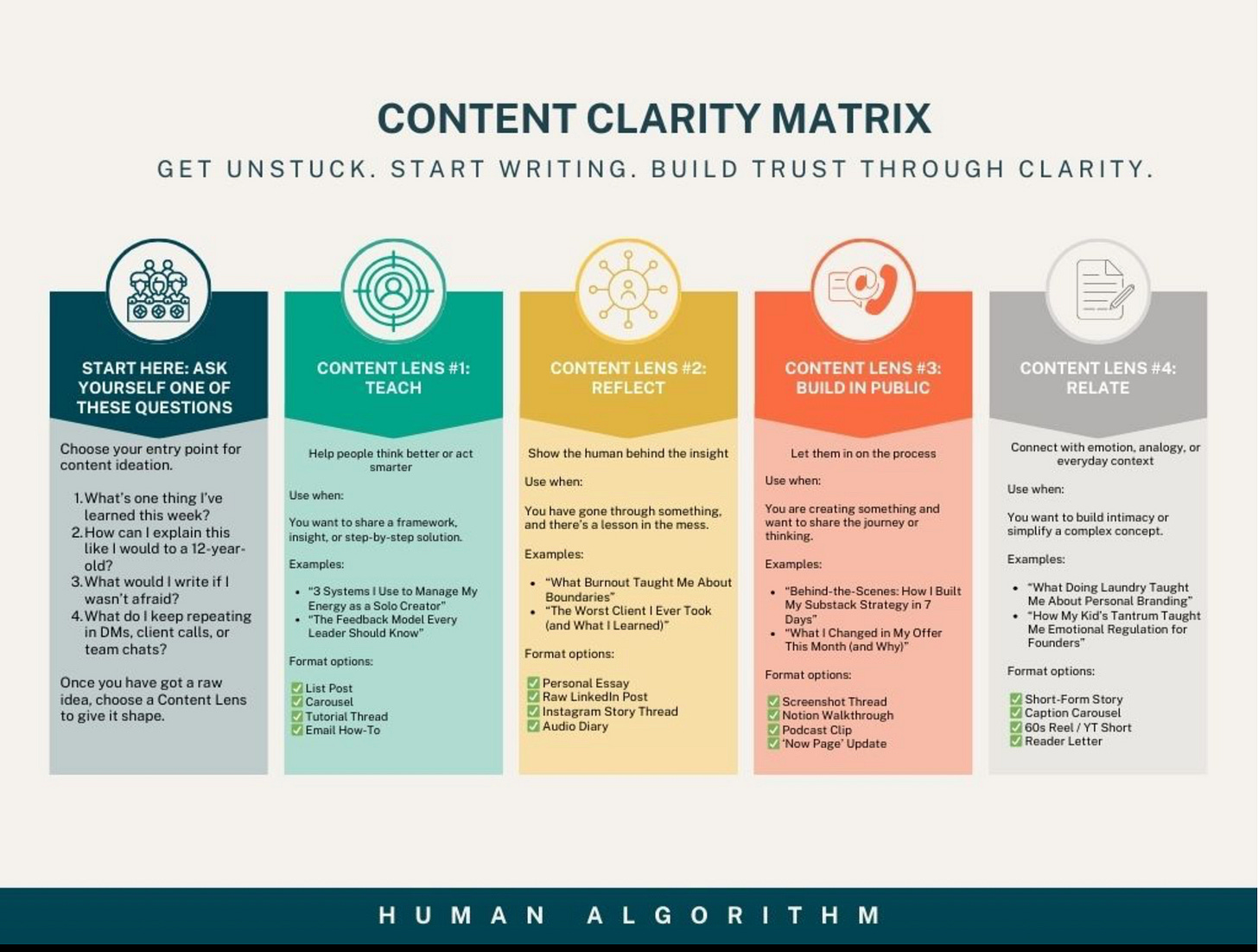 Each lens is a tool, not a rule. And once you start viewing your ideas through these filters, everything shifts. The paralysis lifts. The content becomes clearer, more purposeful. You stop writing for the algorithm and start writing for your people.