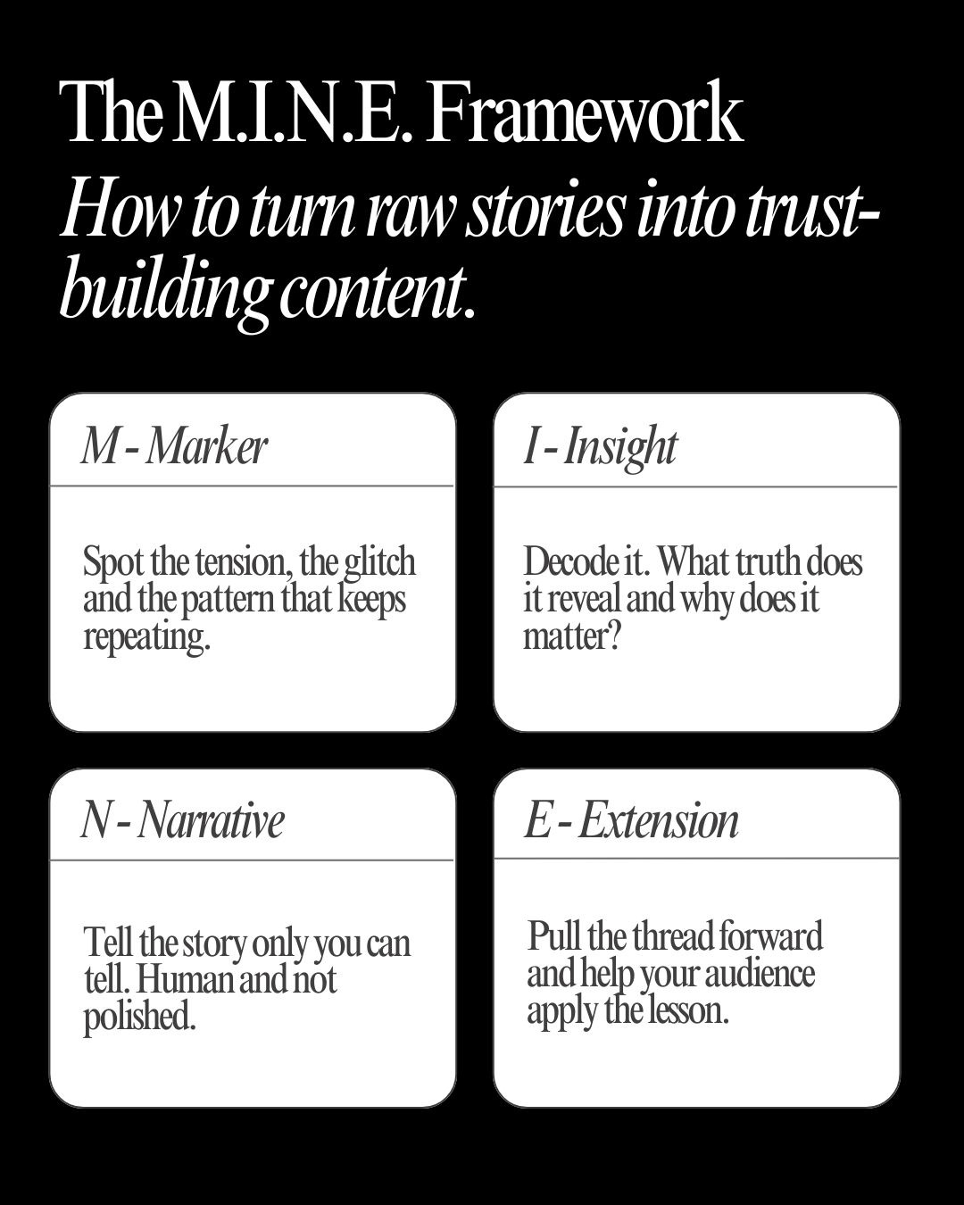 That is when I developed the M.I.N.E. framework because I realised that every great piece of content, whether a post, podcast, or digital product, follows the same emotional and intellectual rhythm of Marker, Insight, Narrative and Extension.